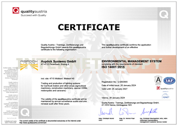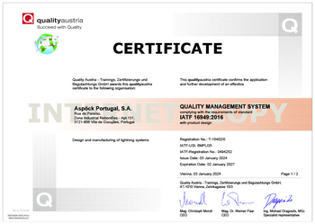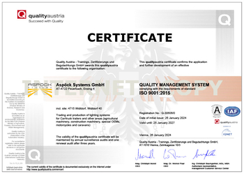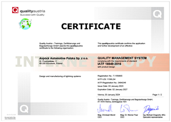 Proven and efficient quality technologies are used in the Aspöck Group in order to produce products in compliance with the international certification standards ISO 9001:2015, IATF 16949 and ISO 14001. All production processes are planned, introduced and monitored by our internal quality management, but also the successful audits conducted by our customers confirm our quality capability.